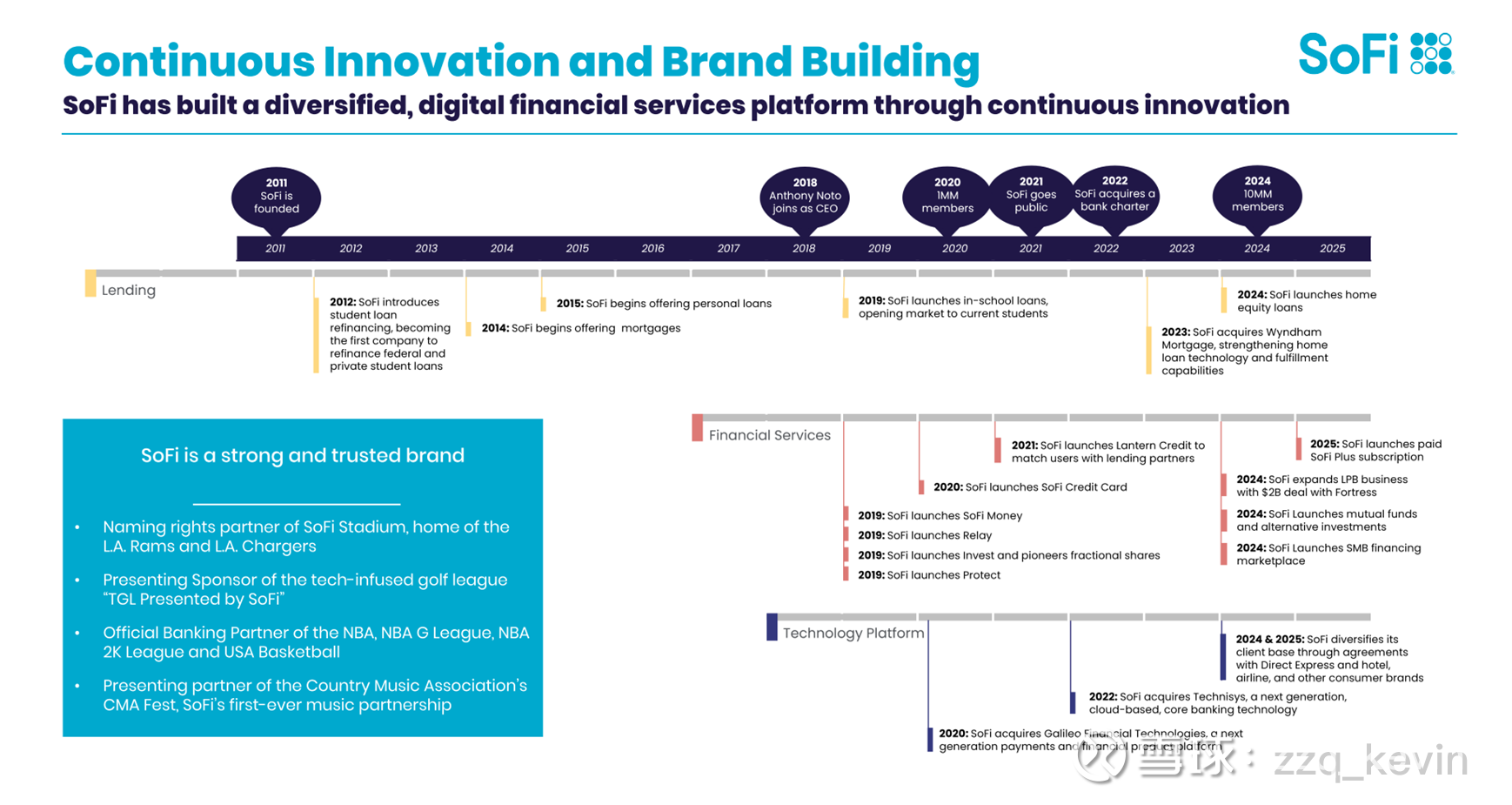 这两个方面基本被凝聚在了一张图中。从左往右看,我们能够知道SoFi建立于2011年,是一家比较年轻的公司;从上往下看,我们能够知道SoFi的业务主要分为三个板块,即贷款业务、金融服务、技术平台。