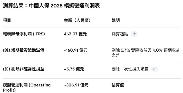 意義:這說明平安去年的利潤並非依靠股市大漲帶來的「意外財」(像人保 2025 年淨利潤遠高於模擬營運利潤,就是因為實際收益率 5.7% 遠超 4.0% 的假設)。平安的利潤完全是由核心業務(保費收入、穩定的利息收入)支撐的,利潤質量極高,沒有「水分」。