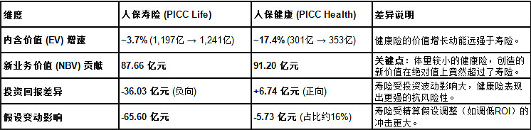 基于您提供的三张图片(人保寿险与人保健康的内含价值变动拆解表及汇总表),我们可以进行深度的对比分析。