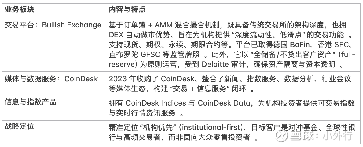 所以在用户上,以机构优先,已经接入主经纪/结算网络,与 Hidden Road、Wyden、Trever 等合作,强调合规流动性与低滑点的大单执行体验。依托 CoinDesk Indices/Data/Media 实现“数据→交易”飞轮,区别于纯撮合平台。Bullish也是美股里比较稀缺的衍生品数字交易所,同时又自持有比较大规模的数字货币。