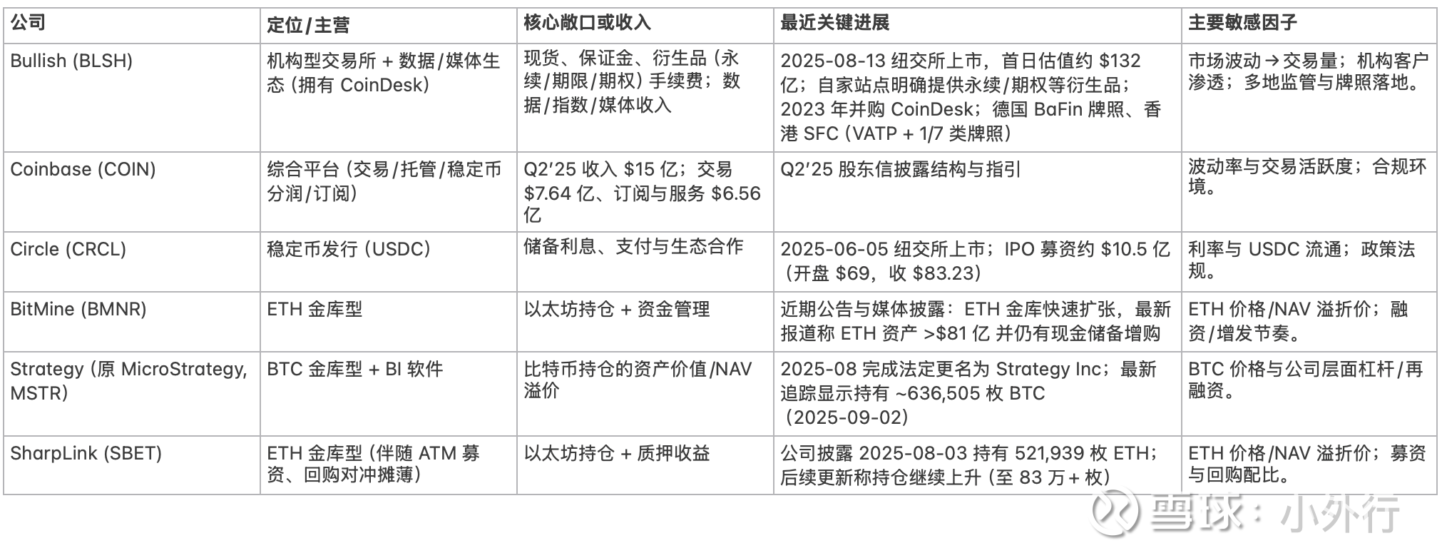 这类公司设计到合规,目前还是比较少的,典型的是$Coinbase Global(COIN)$ 和$Bullish(BLSH)$ 。COIN 的 Q2 构成显示,交易收入 $7.64 亿、订阅/服务 $6.56 亿,波动率下降时交易收入下滑,但多元化能缓冲周期。
