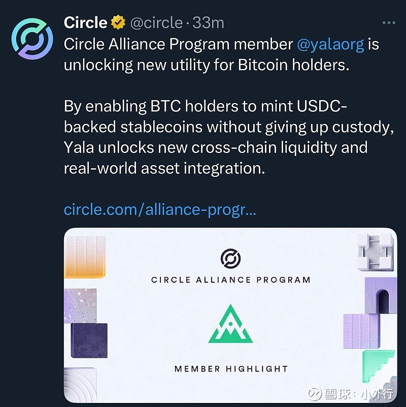 $Circle(CRCL)$ Yala 加入了Circle Alliance:Circle Alliance 是 Circle 推出的一个全球合作伙伴计划,旨在汇聚领先协议、金融科技公司与机构,共同推动 USDC 的使用、发展链上金融生态。