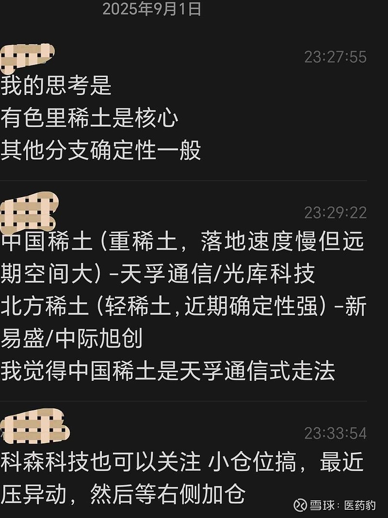 昨晚思考“中国稀土(重稀土,落地速度慢但远期空间大)-天孚通信/光库科技北方稀土(轻稀土,近期确定性强)-新易盛/中际旭创我觉得中国稀土是天孚通信式走法”$中国稀土(SZ000831)$ 肯定没有走完,今天低吸好时机