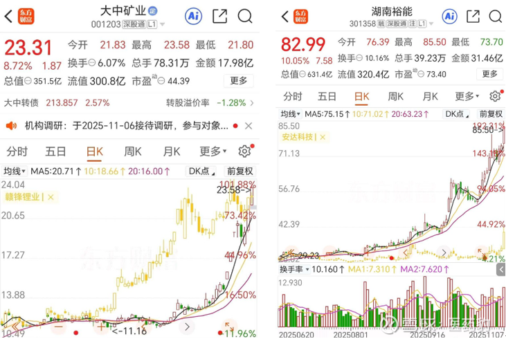 (2)同理在之前,碳酸锂主升时期,9月初到10月中旬,锂矿中军赣锋锂业涨幅75%,大中矿业涨幅7%,盛新锂能涨幅11%。