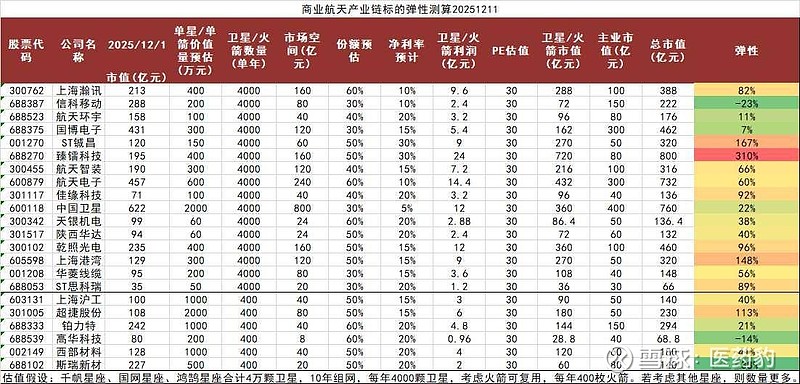 1.弹性测算方式:净利率(科技含金量)X 市占率(壁垒)X 单星/单箭价值量 X 每年星/箭数量$臻镭科技(SH688270)$ 最大2.A股中唯三已经贡献大量卫星零部件业绩的公司$*ST铖昌(SZ001270)$ 臻镭科技$上海瀚讯(SZ300762)$