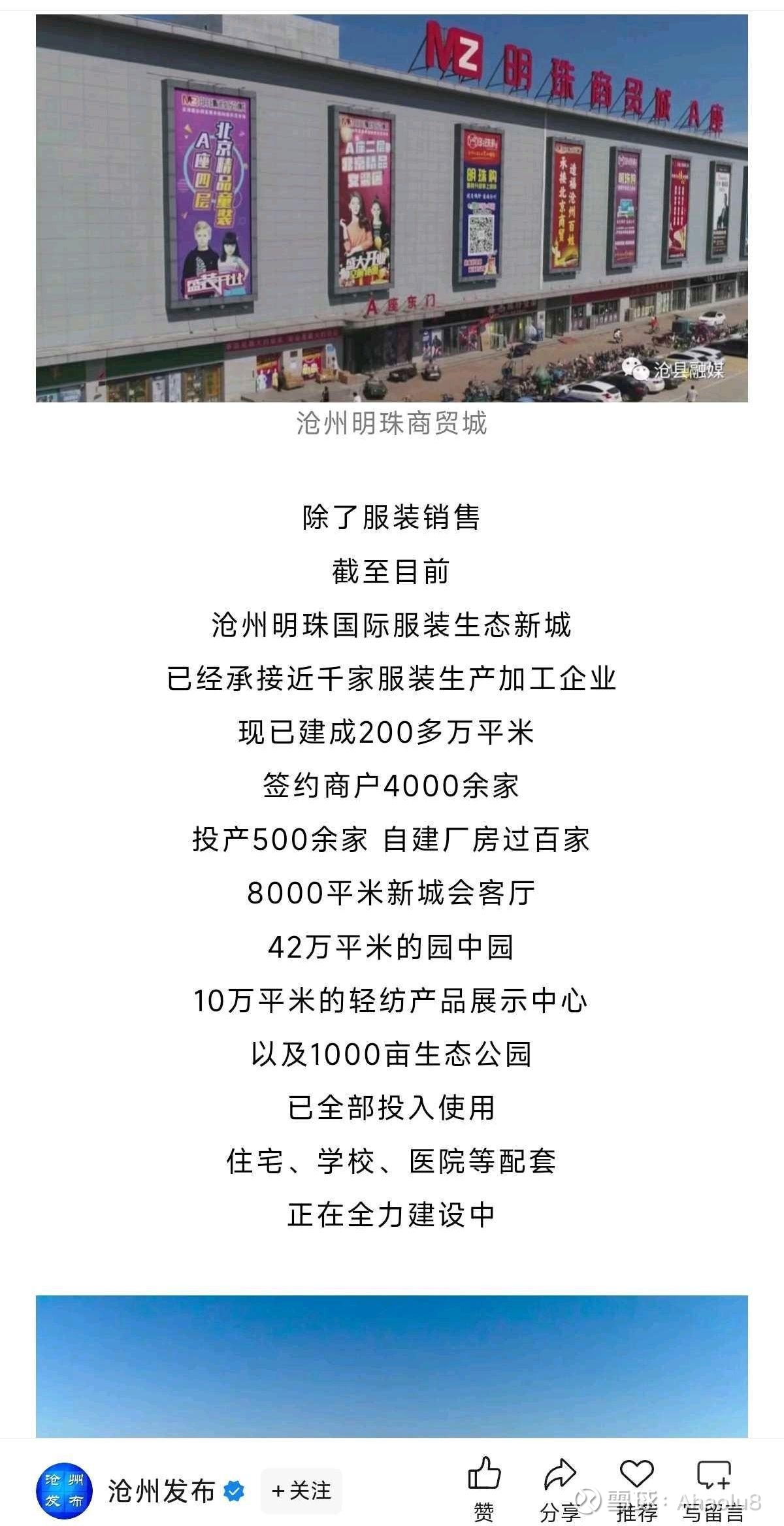 上面这个沧州明珠商贸城,虽然也叫沧州明珠,但是跟上市的沧州明珠没有直接业务关系。这个商贸城建立的目的最开始是为了承接2014年开始北京疏解非首都功能出来的众多企业,想一下,北京那么多不同产业,周边省市但凡能抢到一两个产业集群,不用自己孵化,直接就可以下金蛋了,沧州也确实拉到了众多北京的服装生产贸易企业过来。这点在于桂亭分享的个人经历里可以窥见一二,以他当时60多到现在76的年纪去亲自接待招商,也是蛮拼的。