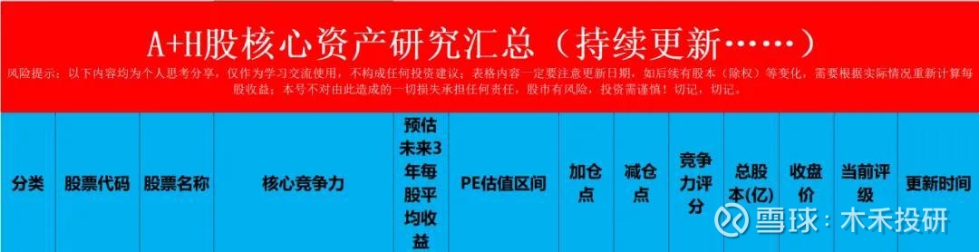 我对优秀公司的看法和平时的交易操作计划,放在专栏里面,公司的估值请参考下面这个《A+H股核心资产研究汇总》表。