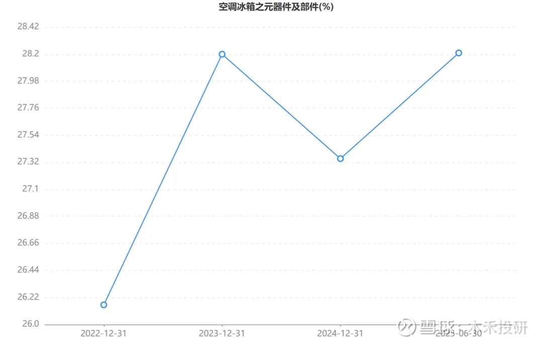 上图是主营业务空调冰箱零部件的毛利率,别看线条波动好像很大,实际上一直保持在27%左右,最低也没跌破26%。