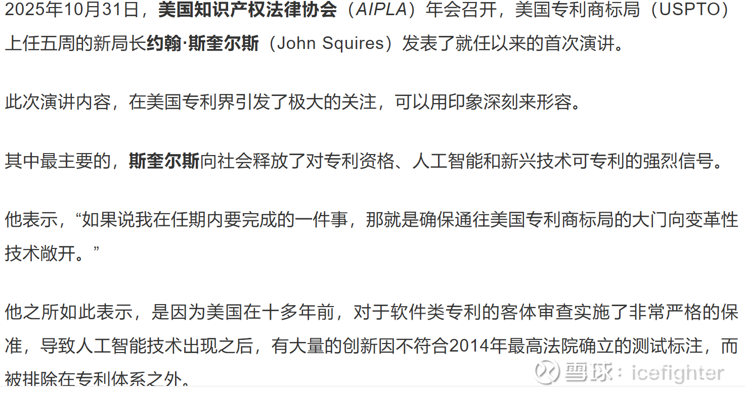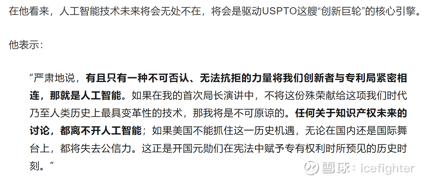 美国新任专利局长发表演讲,他曾经担任过手机芯片巨头高通的高管,科技经验丰厚。他认为,人工智能是未来美国知识产权行业最重要的一件事。