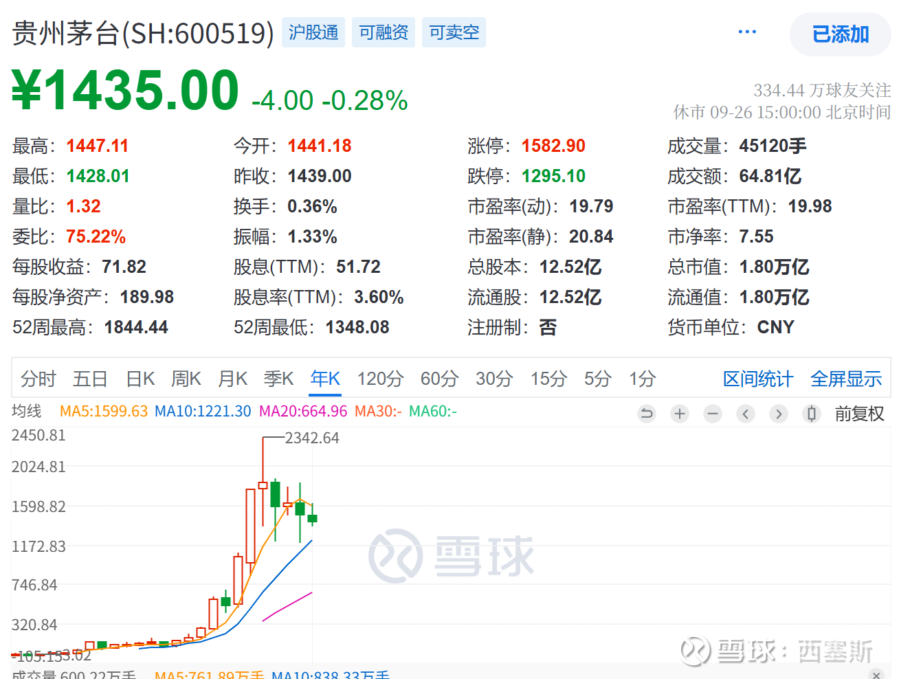 该股票是2001年上市的,按照当前的复权价在4元左右,到了2021年的最高点为2342元左右,20年时间涨了580多倍。这代表着你在当时投入10万,到2021年时最高可达5000多万的收益,可谓是妥妥的超级大牛股,这也是该股被推崇备至的原因。
