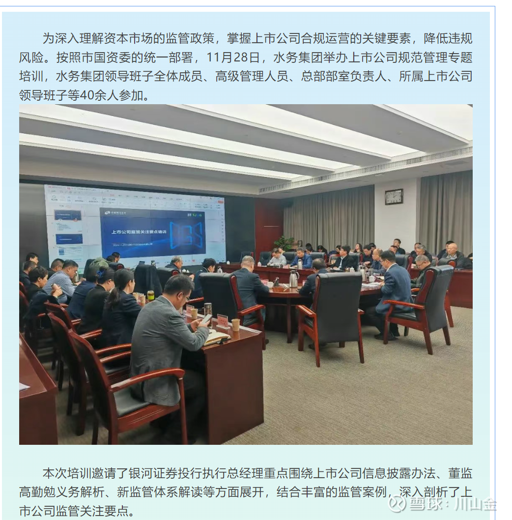 1.去年11月底水务集团的全体领导班子,请他们招募的财务顾问银河证券,对上市公司规范管理做了培训。 解决同业竞争显然是领导们在上市公司规范运营层面的重要任务。