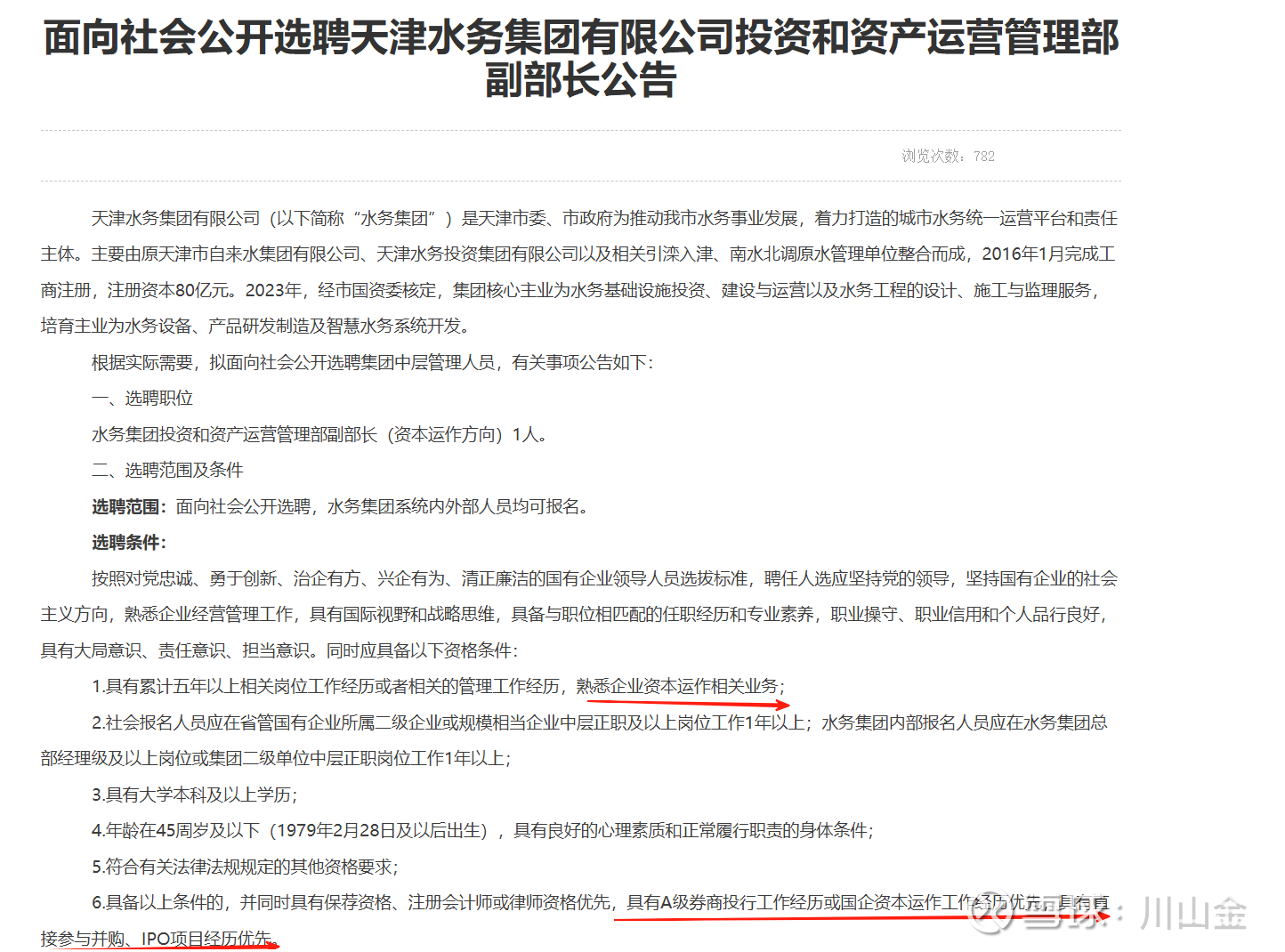 2.根据官网招聘栏目:2025年水务集团层面唯一的社招岗位是投资和资产运营管理部副部长,招聘要求熟悉企业资本运作,有A级券商投行工作经历或国企资本运作工作经历优先,具有直接参与并购、IPO项目经历优先。现在已经5月了,应该是已经招到并开展工作了。