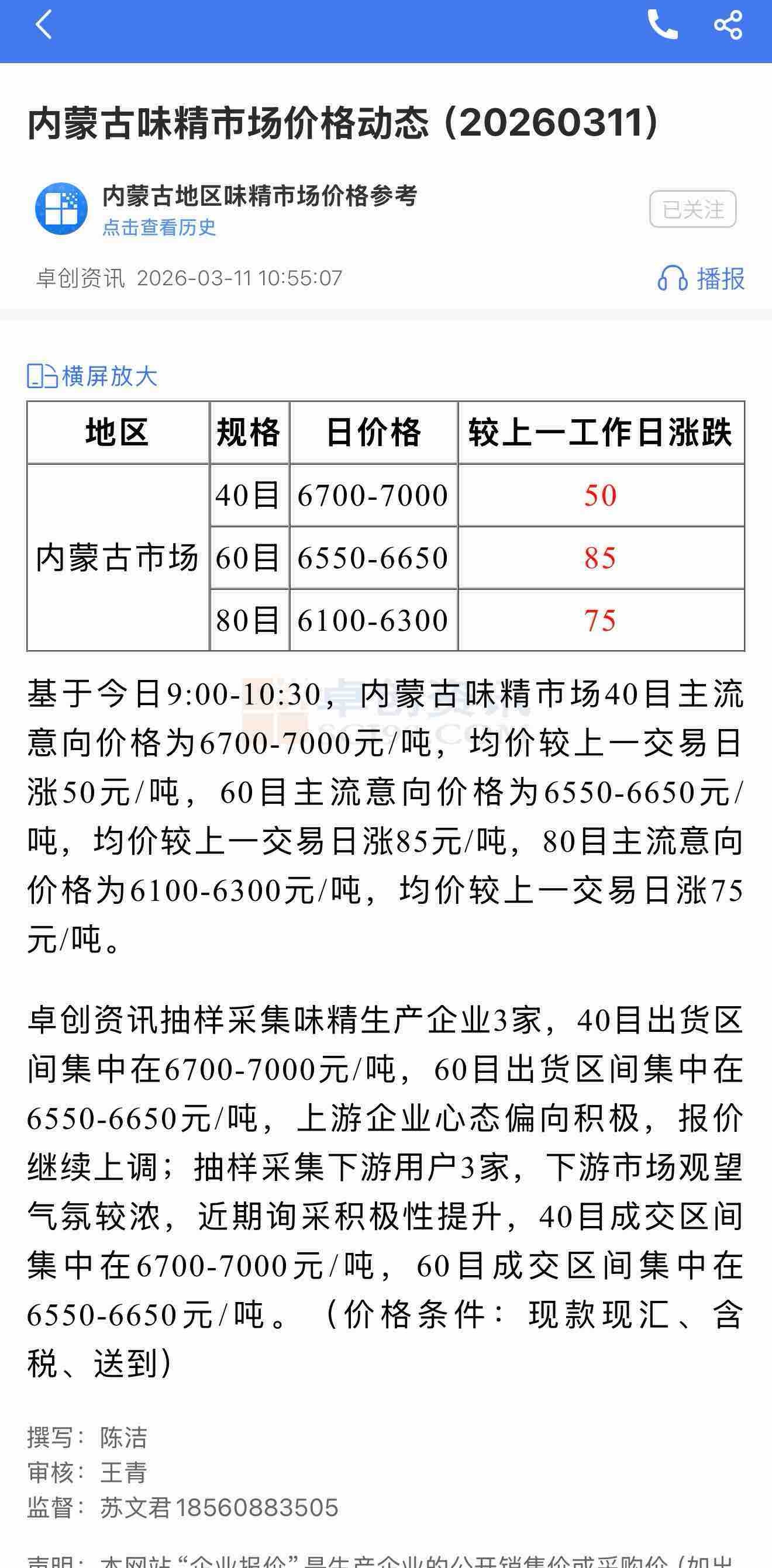 2026.3.11速报:内蒙味精40目主流意向报价的上限今天摸到了7000元,重返7字头