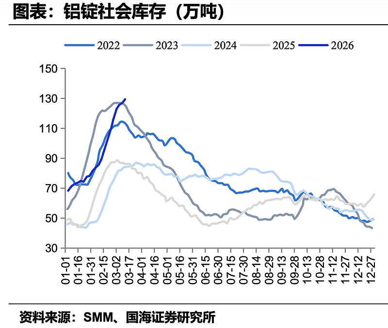 有一些网友对今年铝锭累库表示担忧,我刚找来截至上周四(3月12日)的历年季节性对比图看得更清楚。今年的春节前后铝锭累库斜率和累库持续时间长度确实没啥大问题,累库的绝对数量达到了129.4万吨为历史最高,但也很难把这当成什么大的利空。因为今年春节时间较晚,且进入今年1月1日的起始库存的绝对数字就是70万吨,同样也是较高的起点。根据过往经验,春节前后几周大约累库40~45万吨左右,比如从年初50万吨左右的起点,最高累库至90万吨左右;或者从70万吨的年初起点,最高累库至110~130万吨左右。