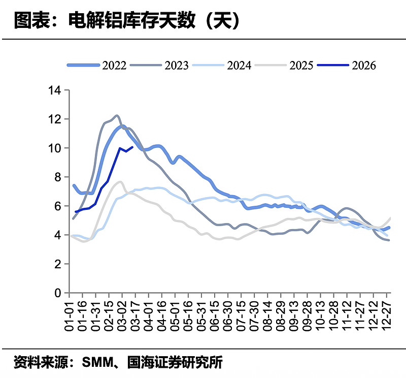 随着电解铝消费量的逐年增长,虽然今年铝锭库存的绝对数字略有偏高,但综合考虑下游需求的“电解铝库存天数”这一指标表现得更正常。截至3月13日,电解铝库存天数为10.05天,目前当然是安全的,并没有发生下游需求破坏,请网友们不用过于担心。