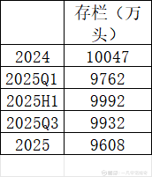 2025年三季度,牛价上涨势头减缓,虽处于盈利区间但盈利水平不高,行业乐观情绪有所减退,补栏积极性下降,活牛存栏小幅下降。