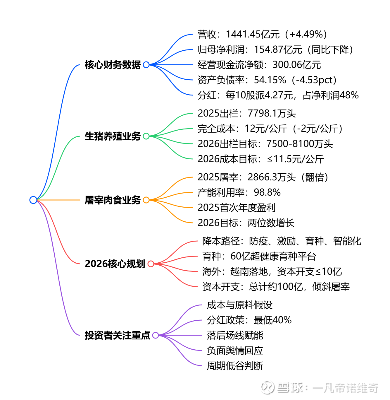 财务表现 营业收入1441.45 亿元,同比增长4.49% 归母净利润154.87 亿元,同比下降(主因猪价下行) 经营活动现金流净额300.06 亿元,现金流充裕 资产负债率54.15%,较年初下降4.53 个百分点,负债总额减少171 亿元 利润分配:每 10 股派现4.27 元,全年现金分红74.38 亿元,占归母净利润48%