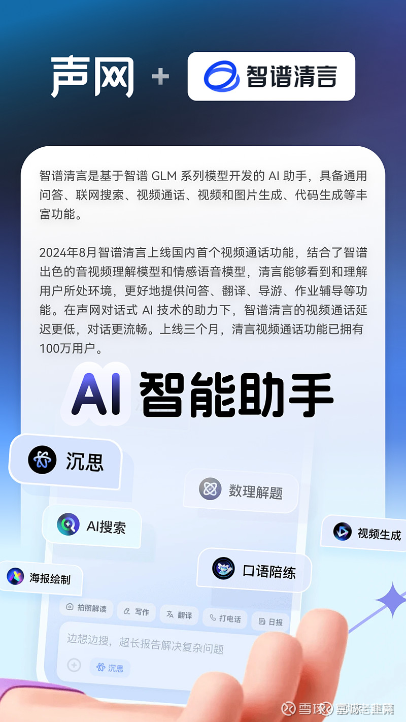 2024年8月智谱清言上线国内首个视频通话功能,结合了智谱出色的音视频理解模型和情感语音模型,清言能够看到和理解用户所处环境,更好地提供问答、翻译、导游、作业辅导等功能。在声网对话式 AI 技术的助力下,智谱清言的视频通话延迟更低,对话更流畅。上线三个月,清言视频通话功能已拥有 100万用户。