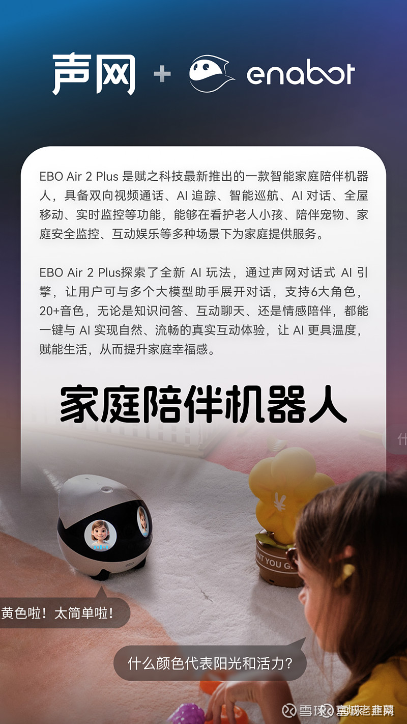 EBO Air 2 Plus探索了全新 AI 玩法,通过声网对话式 AI 引擎,让用户可与多个大模型助手展开对话,支持6大角色,20+音色,无论是知识问答、互动聊天、还是情感陪伴,都能一键与 AI 实现自然、流畅的真实互动体验,让 AI 更具温度,赋能生活,从而提升家庭幸福感。