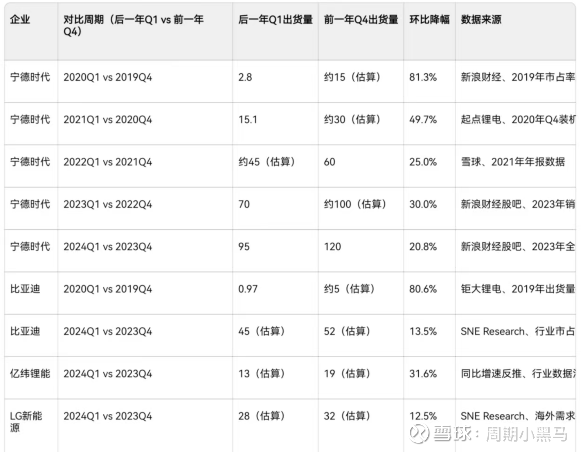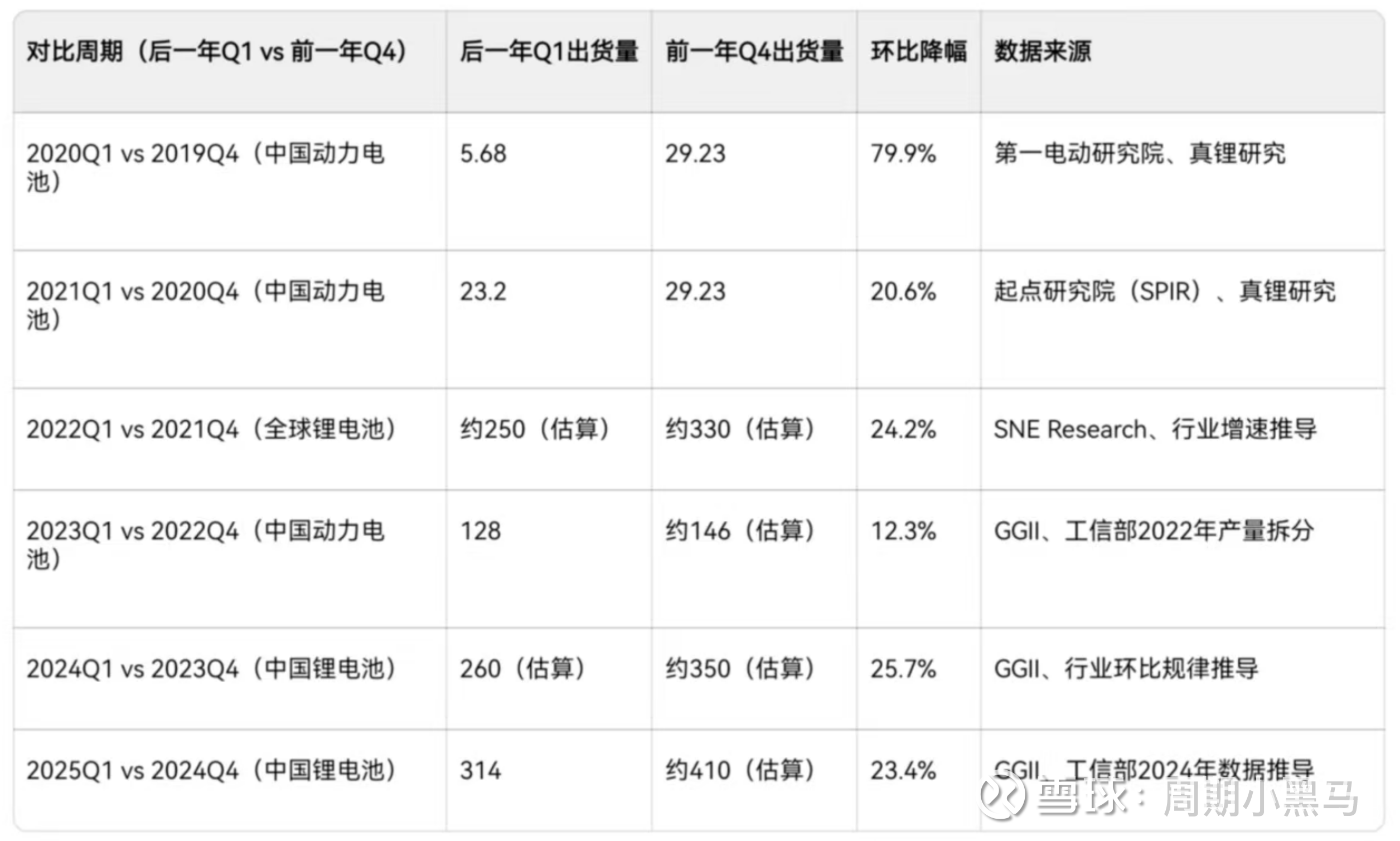 历史上,因为叠加Q4年底冲量和一季度过年等因素的影响,传统而言一季度环比四季度下滑的幅度基本都在20%左右,最好的年份可能也要有-12.3%的下滑(如下表)。而25年四季度由于储能的火爆叠加汽车购置税推波前冲量的影响,单季度出货量几乎达到了历史峰值,所以市场对于一季度的预期会显得略悲观估计,根据我的了解,二级卖方大多数的预期是-10%左右的电芯排产。
