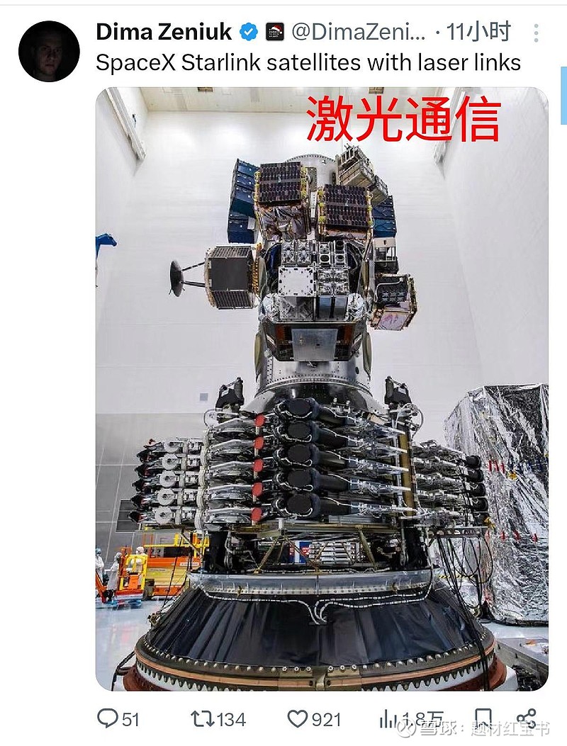 重镑发布:科技博主发布了SpaceX 星链卫星配备了激光通信链路,spaceX正式启动激光通信。