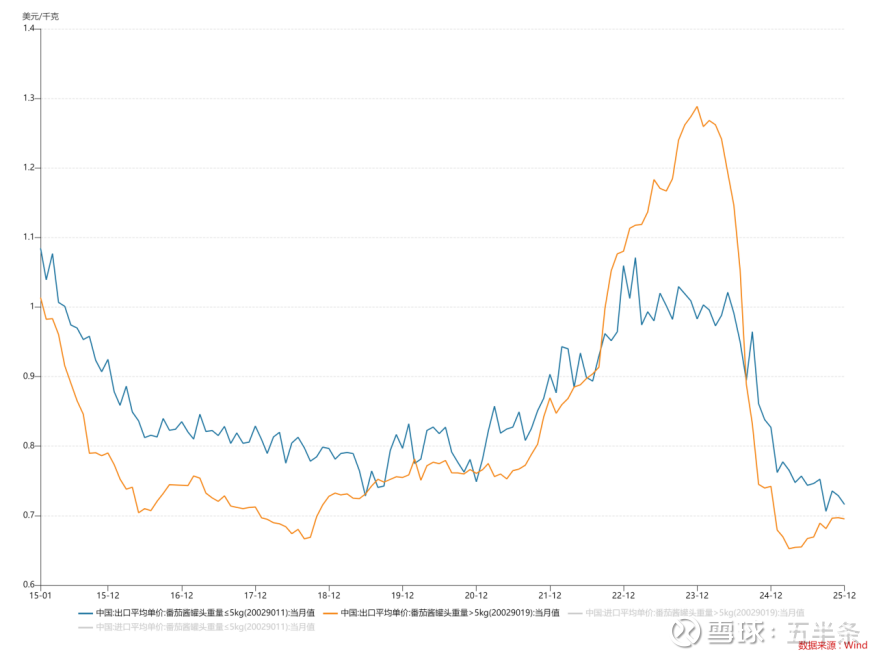 番茄膏业务,即进出口统计口径的大罐装和小罐装番茄,正在经历产能大幅收缩但去库存尚未结束的过程,定量看,中国的加工产能从24年的160万吨急剧收缩至25年的60万吨,降幅与种植面积接近。而需求侧过去两年稳定在160万吨左右(120万吨出口+40万吨国内),当前行业库存大约在80-90万吨水平(截至Q3)。从全球供应来看,过去两年中国一直是最大的出口方,本轮产能收缩在去库存周期结束后将深刻影响全球番茄膏的供需格局。