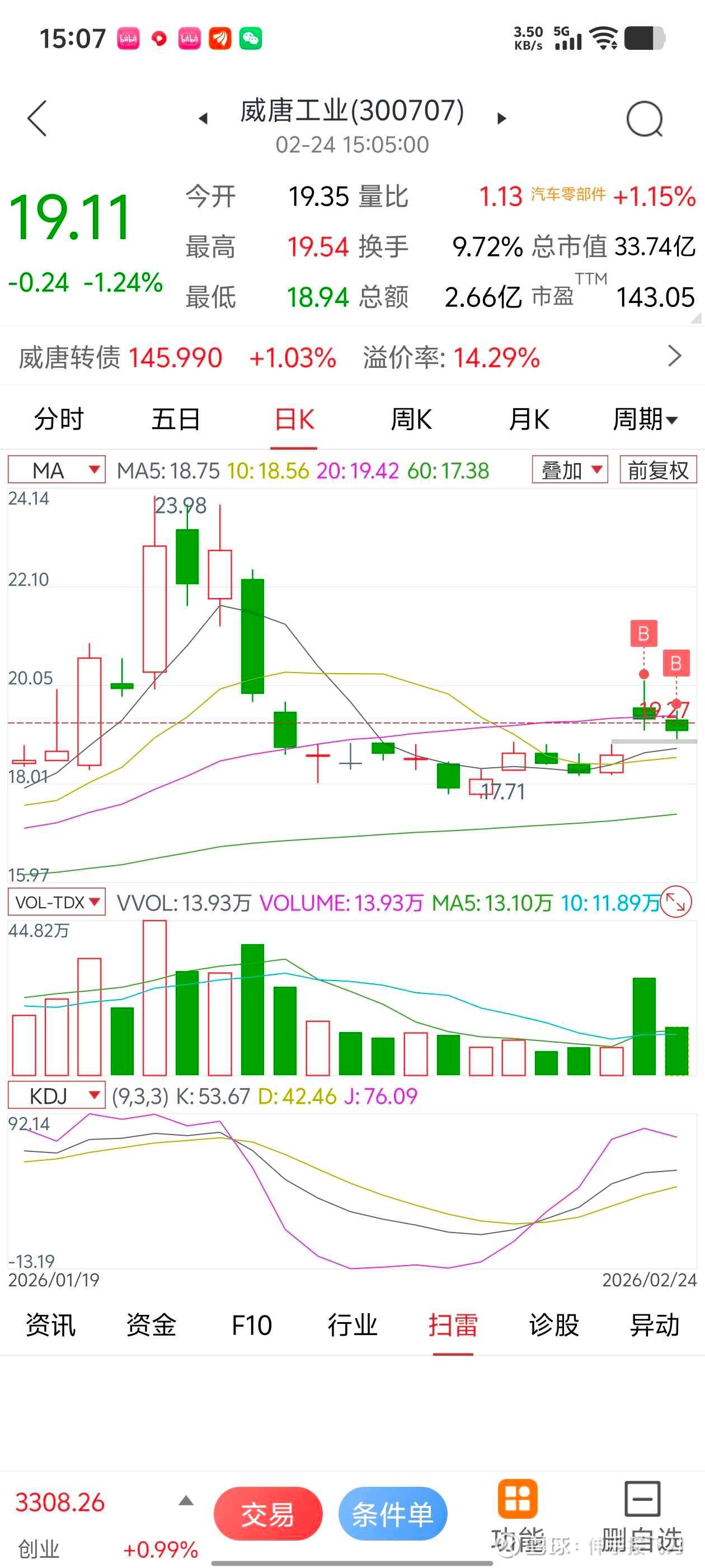 威唐工业今日逆势下跌,耐心逢低买入。目前总投资金额40万元,网格资金约36万元,网格可用资金约33万,已使用的网格资金占总资金的一成,属于低仓位阶段。总盈利约18万元(其中2025年春节前转出盈利资金35000元,2026年春节前转出盈利资金15000元,共计5万元)