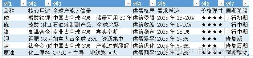 弹性排序:磷 > 硫 > 铬 > 原油 > 钛 > 钾,建议优先布局供需缺口大、需求增速高的品种