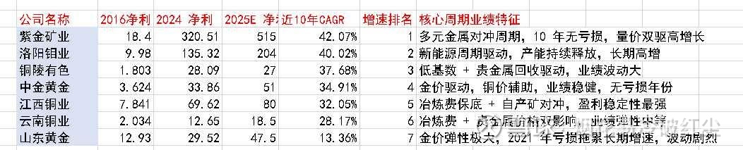 本次重新梳理紫金矿业、山东黄金、洛阳钼业、中金黄金、云南铜业、江西铜业,铜陵有色七家核心矿业企业,聚焦业务构成、核心属性、周期业绩特征三大核心维度,结合2016-2025年净利润及十年CAGR数据,清晰拆解业绩差异的底层逻辑,表格化呈现核心信息,内容更简洁、维度更聚焦。