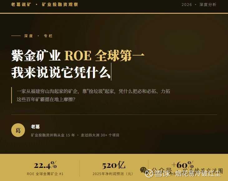 做了这么多年矿业,我见过太多中国矿企走出去交学费的故事——高价买烂矿、建设超支、整合失败、管理层水土不服。紫金走出了一条真正不一样的路:用技术降成本、用速度抢时间、用纪律抄底价、用整合创造价值。ROE全球第一这个帽子,紫金戴得住。核心逻辑清晰: 低成本 × 高效率 × 优质资产 × 超级周期 ,四个因子同时在线,才有今天这个结果。从"贫矿"起家到ROE全球第一,紫金用三十年证明了一件事:在矿业,没有烂矿,只有你没有专业团队干不好。