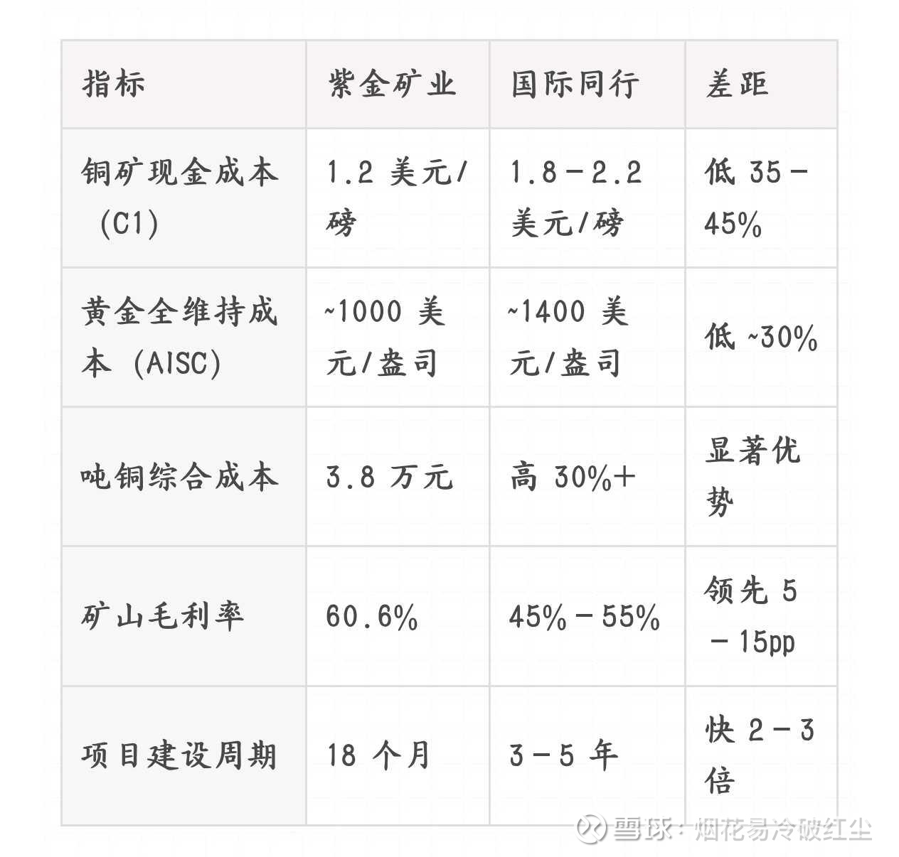 紫金起家的地方,是一座福建专家眼里的"贫矿"——紫金山。这座山被所有人判了死刑,但陈景河偏要在这里挖金子。没有退路,就只能创新。紫金被逼出了一套 低品位矿堆浸技术 ——把别人眼里的废石,用化学方法一点点"泡"出金属来。这套技术,让紫金能以别人一半的成本开采别人不敢碰的矿。"低品位"不是缺陷,是被逼出来的竞争壁垒。全球大量"鸡肋矿"在国际矿企手里是负担,到了紫金手里是宝贝。指标紫金矿业国际同行差距铜矿现金成本(C1)1.2 美元/磅1.8–2.2 美元/磅低 35–45%黄金全维持成本(AISC)~1000 美元/盎司~1400 美元/盎司低 ~30%吨铜综合成本3.8 万元高 30%+显著优势矿山毛利率60.6%45%–55%领先 5–15pp项目建设周期18 个月3–5 年快 2–3 倍国际工程公司还在做可研,中国公司已经开始打桩了。这不是蛮干,是 把矿业工程的流程烂熟于心之后的极致压缩 。塞尔维亚铜金矿,西方同行评估需要五年建成,紫金十八个月投产。西方矿企开一个矿,要先开五年会议。 紫金开一个矿,十八个月见产量。 时间本身就是利润。