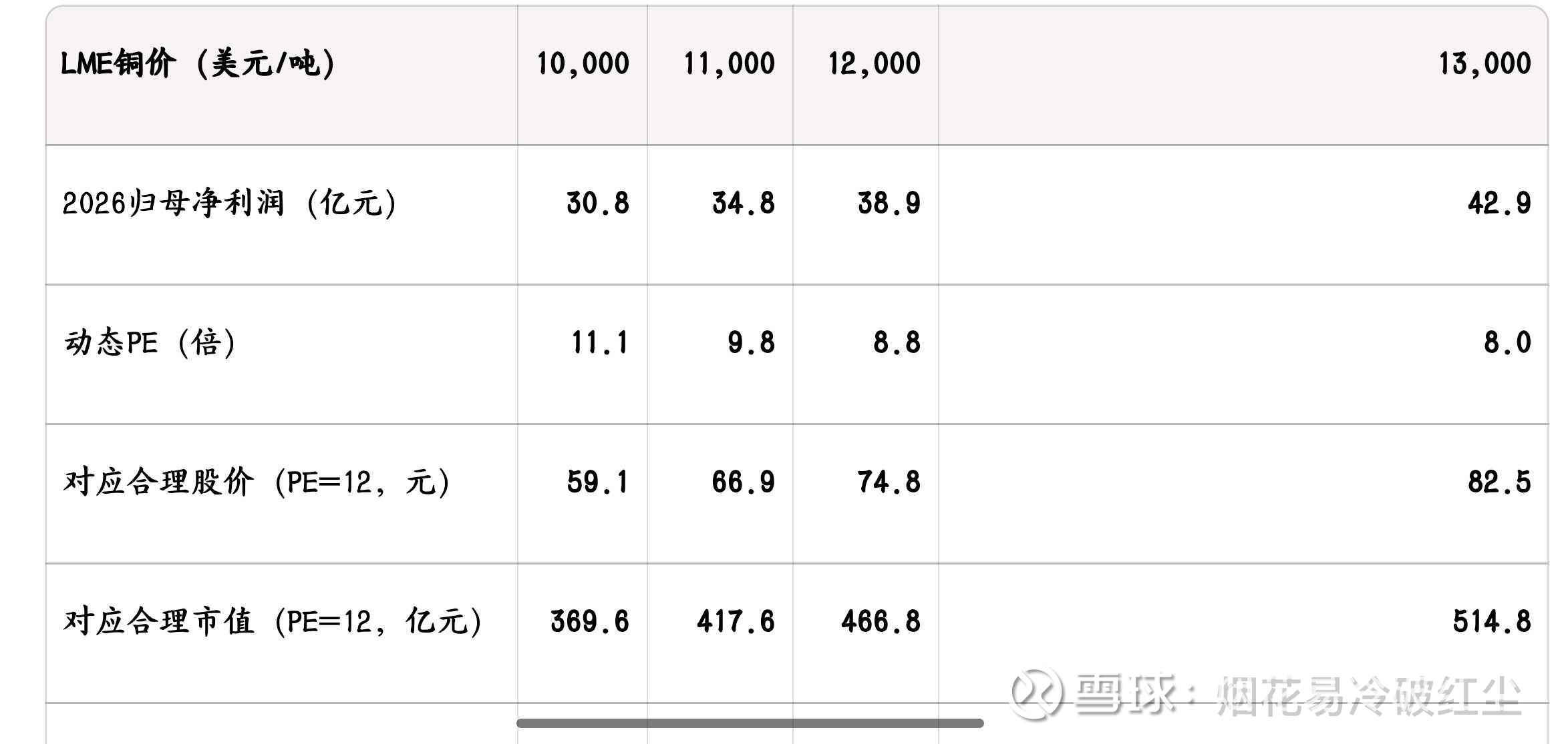 说实话,a股的板块效应真严重,太多人不看基本面,只看技术面图形来做股票。特别是很多绩优股明明靠业绩推动的增长,与那些靠估值拉升的一个涨跌幅就很没有道理(甚至上涨的时候因为名字不带铜远远比不上,但是下跌的时候照杀不误)。从最高点90块到现在已经回落了40%了,股价已经跌回到铜9500美元一吨的时候。简单算了一下,不同铜价下的利润与估值。