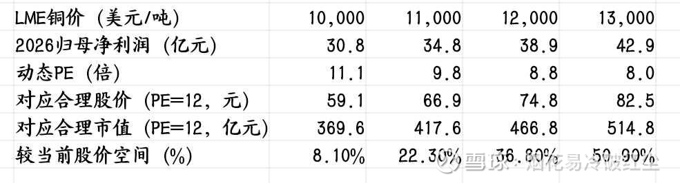 铜价10000美元/吨对应归母净利润约31亿元,铜价11000美元/吨对应归母净利润约35亿元,铜价12000美元/吨对应归母净利润约39亿元,铜价13000美元/吨对应归母净利润约43亿元。