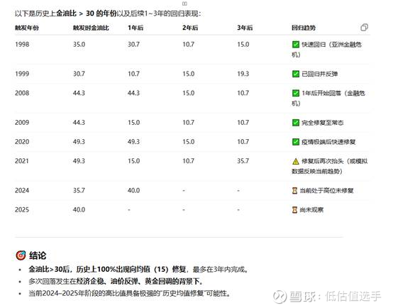 一、金油比:历史金油比均值≈15,金油比 >30 是强烈的市场信号,提示“油价相对黄金极度便宜”。在全球避险情绪或衰退预期被修正后,油价或能源板块具备极佳的均值回归潜力。高金油比是少数机构看重的反向信号,每一次>30都带来数倍能源资产机会。若你能容忍短期波动,2025年是构建能源类资产组合的良机。网页链接
