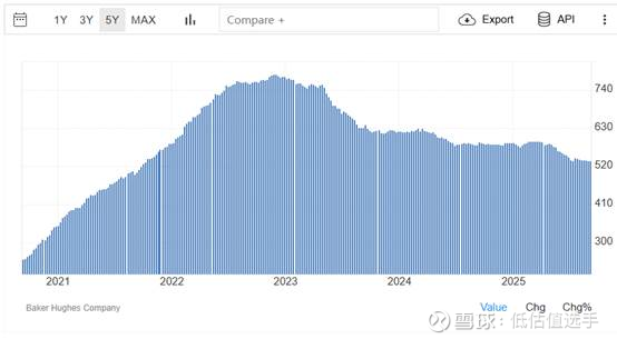 美国石油钻井数量的变化,今年油价低于70美金,钻井数量明显减少了: 网页链接