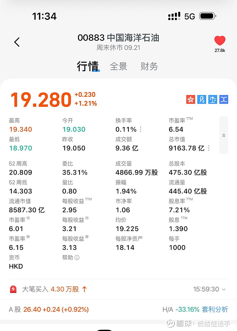 写于2025/09/21 中国海洋石油 市值9163港币