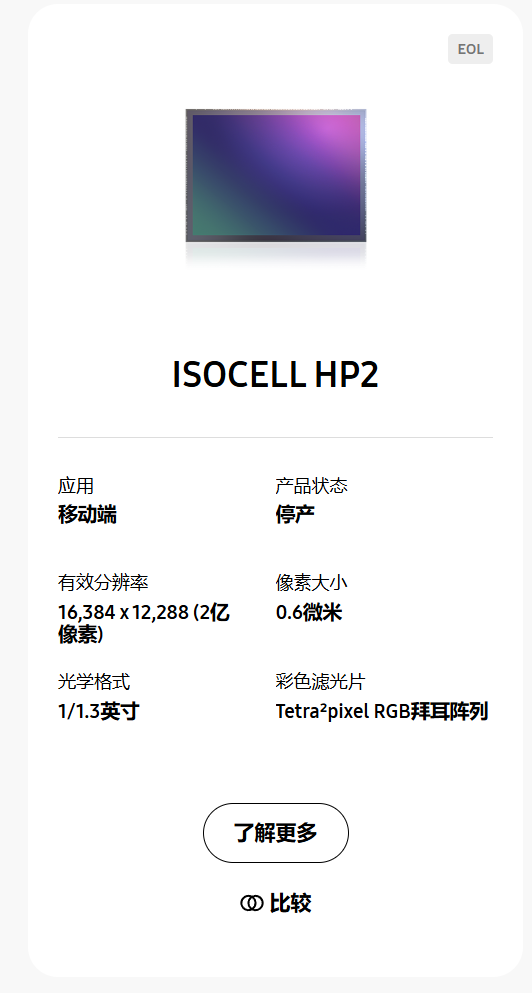 三星半导体官网显示,ISOCELL HP2目前已经是“停产”的状态,后继型号目前还不得而知,倒是HP9等中端型号因长焦打出了口碑,JN系列在副摄中混得也不差,是个好消息。