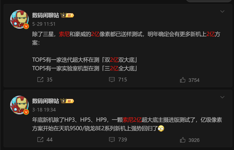 5月份,他又释放了新消息:除了三星,索尼和豪威的2亿像素已经送样测试,明年确定有更多搭载2亿像素方案的新机上市,其中一家迭代超大杯正在测试双2亿双大底方案,另一家实验机正在测试三2亿全大底方案。