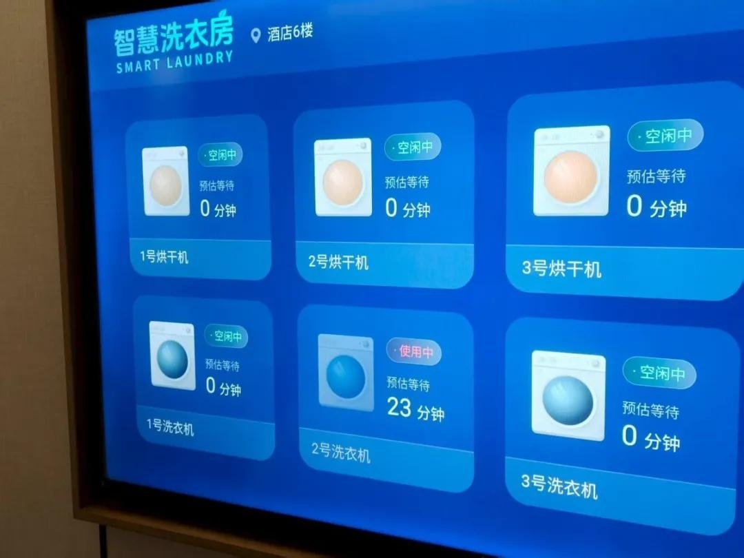 在这家酒店,只要对电视说一声「欢朋欢朋,我要洗衣服」,电视就会主动跳转到洗衣房的中控台,实时看到每一台洗衣机、烘干机的工作状况:哪台机器刚刚开始洗衣流程,哪台机器还剩 3 分钟就能空出来,这些信息在酒店房间里就能看到;不再需要抱着衣服在洗衣房里「排机器」,也不需要在洗衣房的沙发上「罚坐」一小时等烘干。