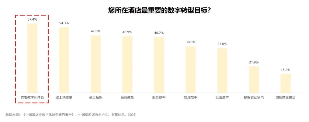 面向国内酒店行业的调研数据也揭示了酒店智能化与住客满意度的关系:在 2025 年《中国酒店业数字化转型趋势报告》中,宾客数字化体验以 57.4% 的得票率,成为酒店行业最重要的数字转型目标。