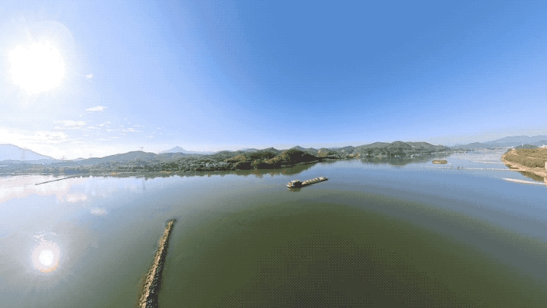 全景镜头的「无死角」优势,在开阔场景中更是发挥得淋漓尽致。小雷在周末去郊外的江边拍摄,只是单纯让无人机沿着水面平行飞行,全程没有刻意调整角度。回来导出素材后,光是这一段5分钟的飞行记录,小雷就能裁切出了四种完全不同的成片:第一种是高空俯拍,展现江面全貌和周边的山林环绕;第二种是水平视角,聚焦水面波光和江上的货轮;第三种是低角度贴水拍摄,镜头掠过水面,拍出「水上飞行」的沉浸式画面;第四种是仰拍视角,以天空为背景,捕捉无人机爬升时的动态感。要是用传统无人机,这四种视角至少要飞四次才能拍全,还得担心每次起飞的位置是否精准,而影翎Antigravity A1一次就搞定,效率直接翻了四倍。