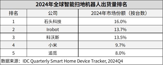 而在同时期,石头科技发布一份面向投资市场的材料,明确自己的扫地机器人市场份额为全球第一,2024年的销量达350万台,海外收入已占石头科技营收的50%。再看科沃斯,它作为另一家上市龙头,2024 年营收与利润都在增长,并且市占率上升到全球第二,营收和利润都在增长。