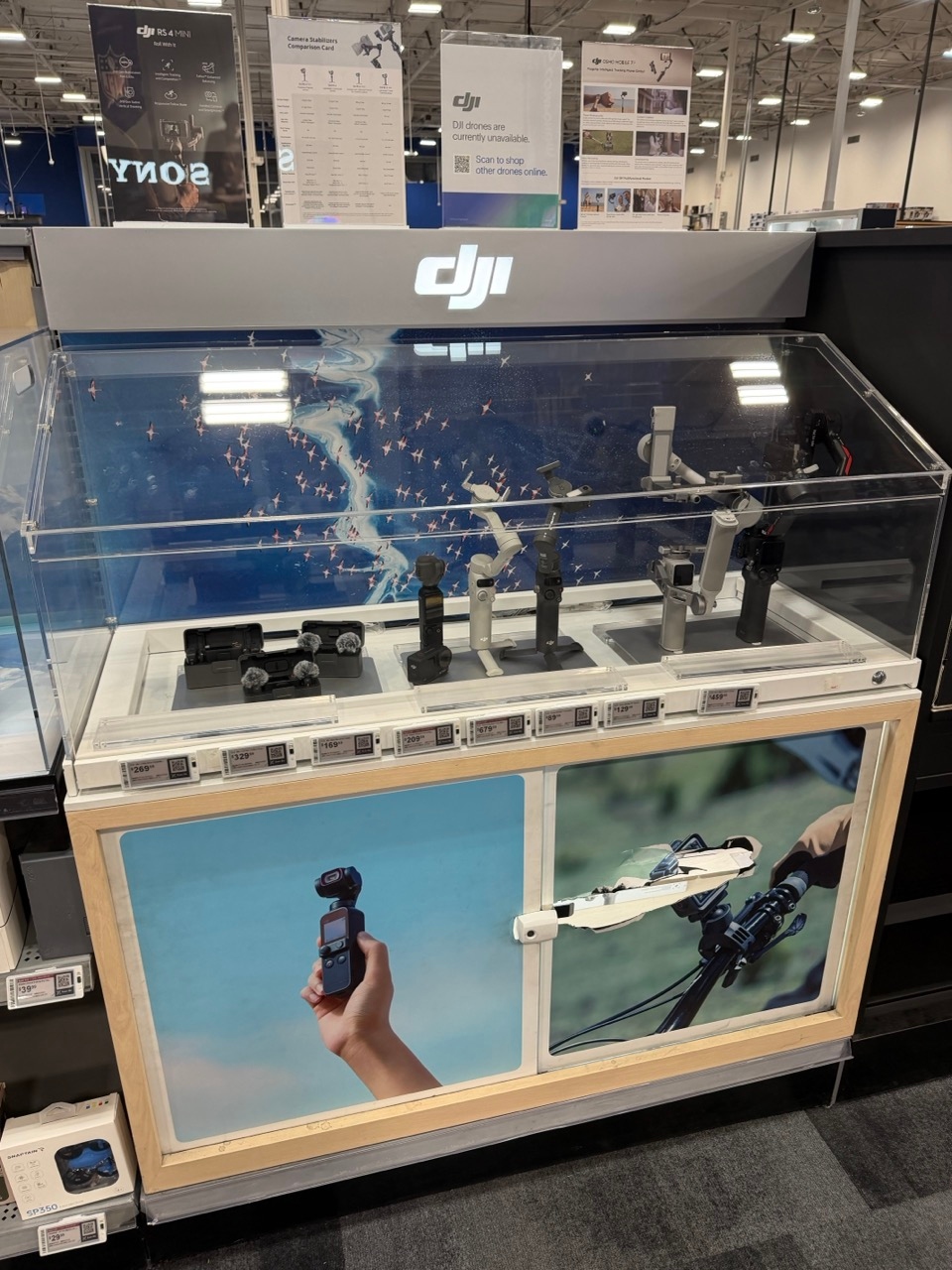 探店过程中,小雷惊喜发现大疆品牌身影,而且还是品牌小专柜陈设,不过只有智能影像设备,并无无人机产品。