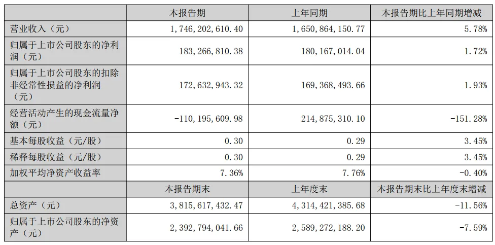 上半年营业收入17.46亿,同比增长5.78%,净利润1.83亿,同比增长1.72%。