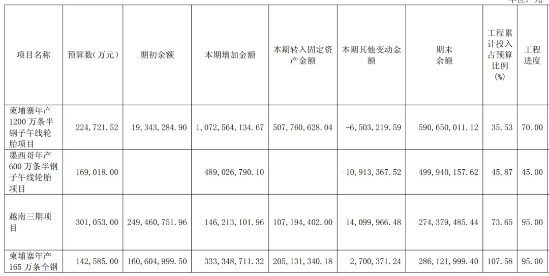 公司目前的在建工程包括,柬埔寨年产1200万条半钢子午线轮胎项目、墨西哥年产600万条半钢子午线轮胎项目、柬埔寨年产165万条全钢子午线轮胎项目、越南三期项目、印尼年产360万条子午线轮胎与3.7万吨非公路轮胎项目。