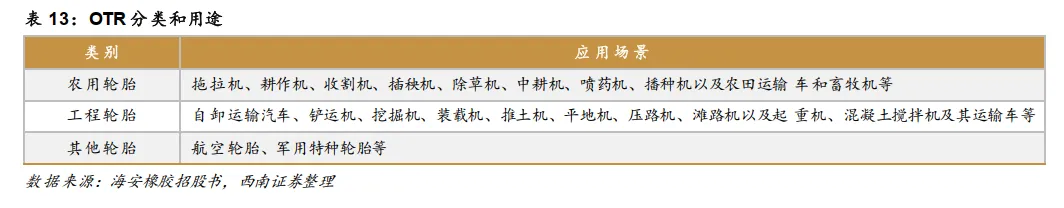 按照轮胎用途不同,轮胎可分为公路用轮胎和非公路用轮胎,其中非公路用轮胎简称OTR,主要应用在大型农场、露天和地下采矿场、港口码头、建筑业或其他特殊领域等。非公路用轮胎的使用场景通常路面环境差,对轮胎的耐磨性、耐撕裂性和耐老化性要求很高。
