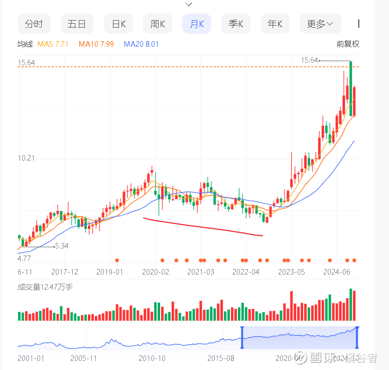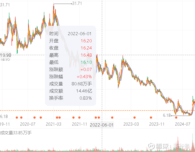 2.股价的上涨,从20年到24年股价总体是一直上涨的,中间也有22年下半年的回调,也有多次的下跌。