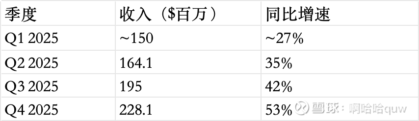 如果进一步推演至2027年全年EBITDA盈利(管理层指引),假设2027年收入在$15-16亿区间(基于30%+增速),EBITDA利润率5-10%,对应EBITDA约$0.75-1.6亿,EV/EBITDA约26-56x。这个范围很宽,盈利预测有高度不确定性。