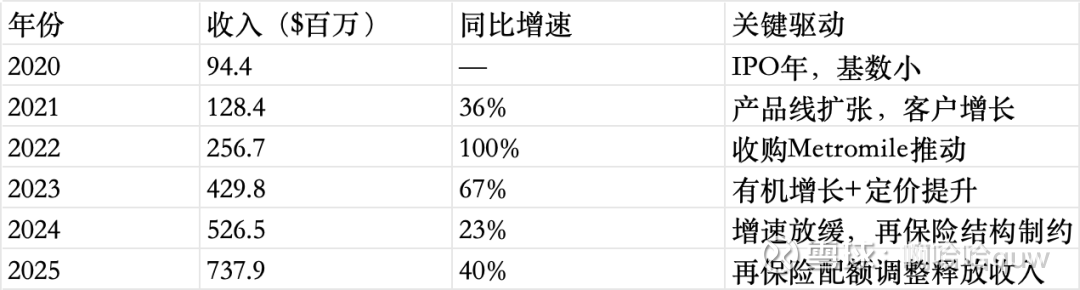 过渡期: 由于再保险合同按风险附着基础(risk-attaching basis)运作,新旧合同有重叠期。2025年下半年综合分出比例约为45%(新合同的保单按20%分出,旧合同到期前仍按55%分出),预计到2026年Q3完全过渡至20%。这意味着2026年收入还将继续受益于这一结构性变化——管理层2026年收入指引$11.87-11.92亿(同比+61%)中,相当一部分来自配额过渡的尾部效应。