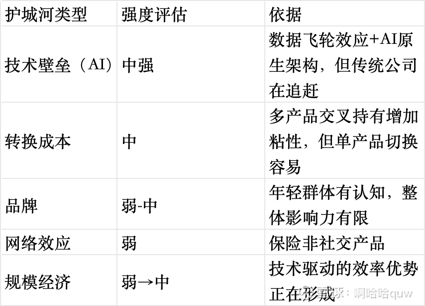 技术壁垒(AI定价和理赔)——这是Lemonade最有辨识度的护城河。传统保险公司也在使用AI,但它们的系统是建立在遗留技术栈之上的”嫁接”,而Lemonade从第一天就以AI为核心设计整个业务流程。298万客户的行为数据持续训练定价模型,每一笔保单和理赔都在改善算法精度。这种数据飞轮具有一定的先发优势,但壁垒的持久性取决于传统公司AI化的速度和效果。